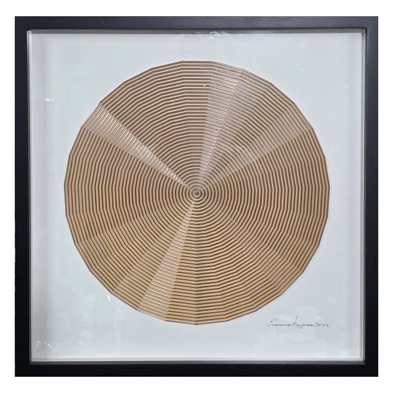 DESCRIPCIÓN: Ácido poliláctico fundido sobre soporte preparado, año 2024. Obra enmarcada. Desarrollado con tecnologías de impresión 3D eco amigables. Color violeta-verda