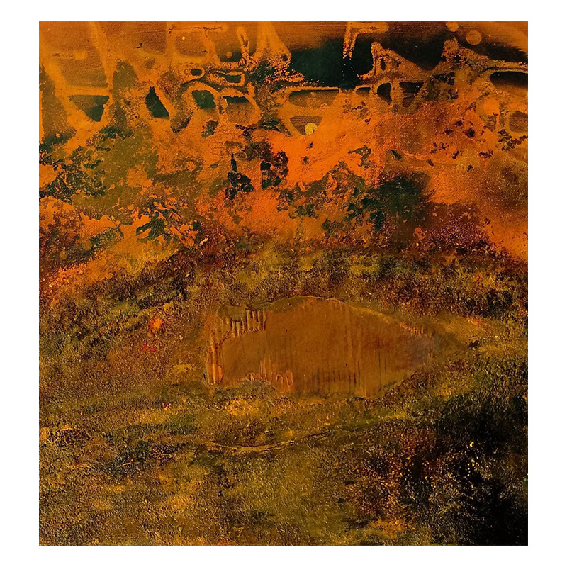 MEDIDA: 40 x 40 cm DESCRIPCIÓN: Acrílicos, tintas al alcohol, pintura en spray y óxido de fierro sobre lienzo intervenido en bastidor de 4 cm