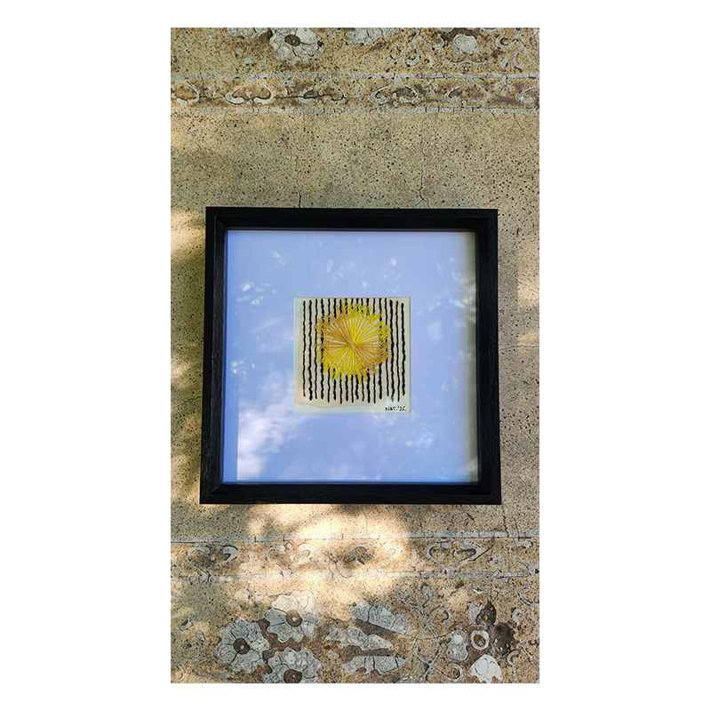 DESCRIPCIÓN: Papel de acuarela intervenido con pintura acrílica y bordado con hilos de algodón. Medidas de obra 10 x 10 cm. Obra enmarcada