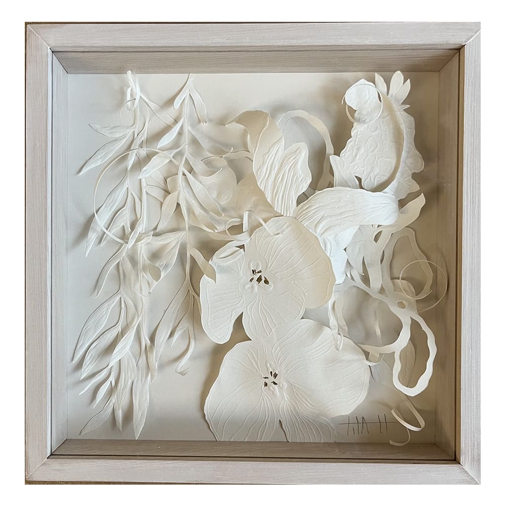 MEDIDA: 26 x 26 cm DESCRIPCIÓN: Gofrado, calado y collage. Obra firmada y enmarcada en caja de madera blanca